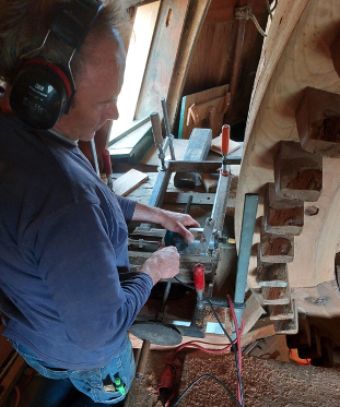 Molenmaker Ole Streumer van RWS maakt het bovenwiel zuiver rond.