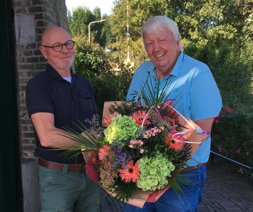 Dick van Wingerden geslaagd voor molenaarsdiploma ontvangt een bos bloemen.