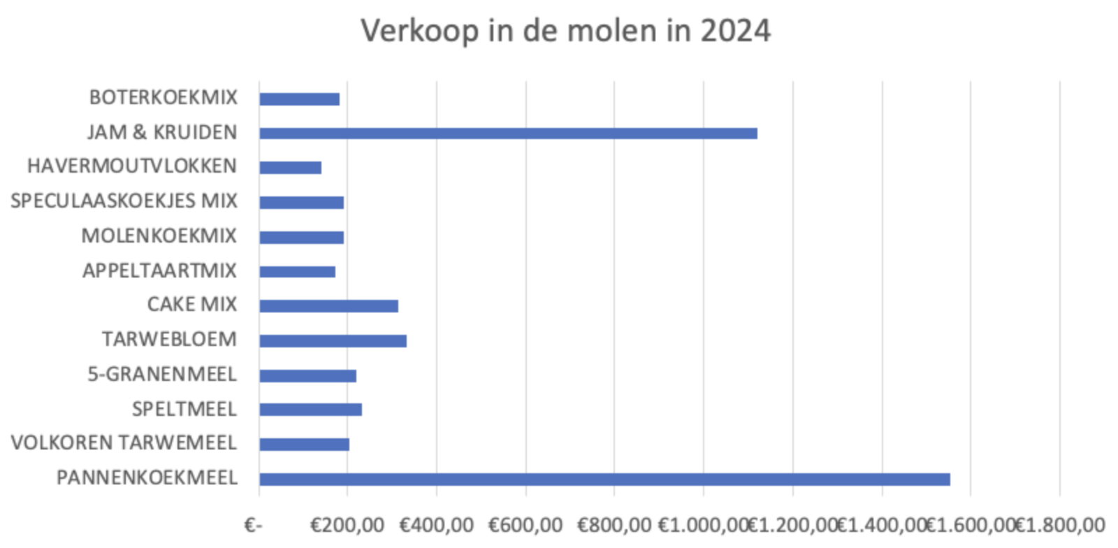 Naast de meelproducten Volkorenmeel en Pannenkoekenmeel wordt er nu ook Speltmeel, Speltbloem, 5-Granenmeel en Tarwebloem verkocht in de molen “De Vier Winden”